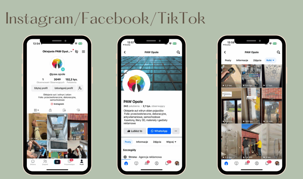 Profesjonalne prowadzenie profili na Instagramie, Facebooku i TikToku – tworzymy angażujące treści, estetyczne grafiki i trendujące wideo, dzięki którym zbudujesz silną markę, dotrzesz do nowych klientów i zwiększysz swoją widoczność w sieci.